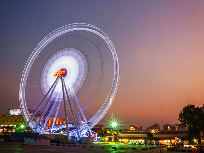 Asiatique is a mix of 2 of the most popular shopping experiences in Bangkok: a night bazaar and a shopping mall. Around 10 minutes downstream from Saphan Taksin BTS Station. Believe it or not, Asiatique's old site was a once-bustling international trade port. Now, it's a huge replica warehouse complex with over 1,500 boutiques shops and 40 restaurants.