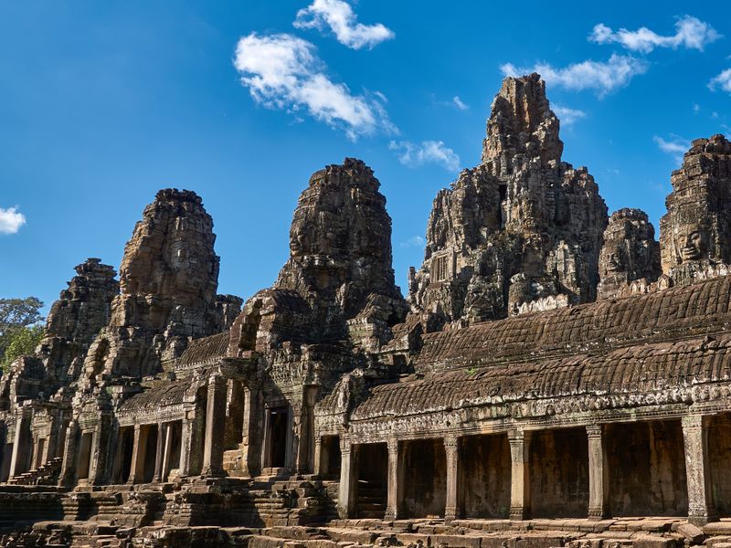 One of the most impressive temples to visit in Siem Reap, Bayon Temple is a picturesque and surreal temple harboring a myriad of smiling stone faces. It was built around the late 12th or early 13th century and served as the state temple to the renowned King Jayavarman VII. The temple sits at the center of Angkor Thom, the last enduring Angkor capital of the Khmer Empire.