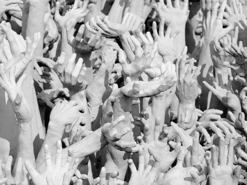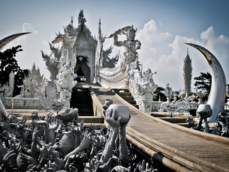 One outstanding thing inside Wat Rong Khun is the "Phra Ubosot", or the main ordination hall, which has a unique artistic identity. There is the shape of the brace and the details which are totally different from other temples. The color white represents the holiness, while the glistening white glass captures the sparkle.