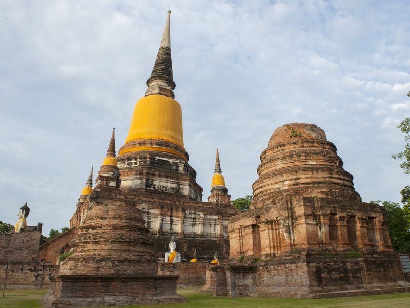 Wat Yai Chai Mongkol, an ancient royal monastery, is one of the most important temples in Ayutthaya province. It was constructed by King Ramathibodi I (King U-thong) in 1357 and destroyed by the Burmese in 1766. At first, it was known as Wat Pa Kaew. The chedi (pagoda) of Wat Yai Chai Mongkol is one of the landmarks of Ayutthaya. It is the large central chedi that was built in 1592 by King Naresuan, one of Ayutthaya’s greatest kings, to celebrate the victory over the Burmese. The Chedi was named Phra Chedi Chaiya Mongkol and the temple became known as Wat Yai Chai Mongkol which means the “Great Monastery of Auspicious Victory”.