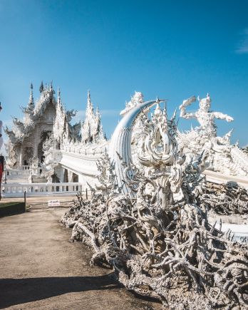 Arrive Wat Rong Kun or White temple, the one of the most stunning in the world, let’s marvel at this work of art. Inside, there are 9 buildings. The temple is delicately designed and even is an art exhibit!